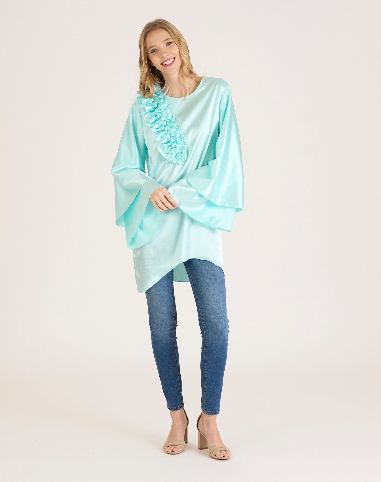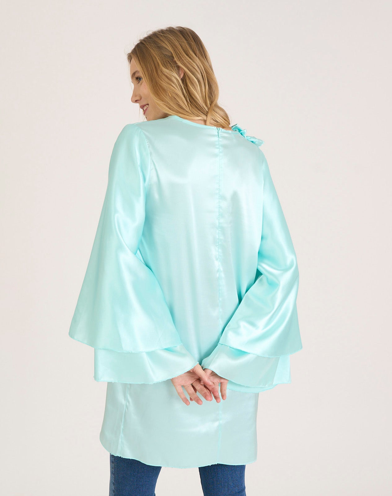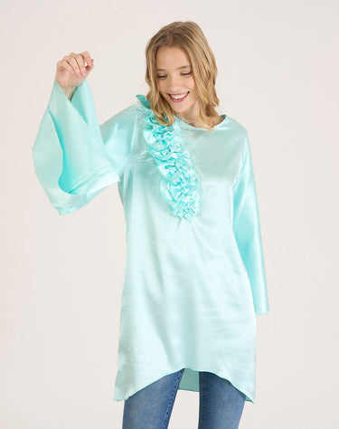 Camisa larga efecto vestido con detalle de flores brocadas y plumas en el lateral. Mangas anchas con acabado de doble volante. Cierre con cremallera trasera. Azul Cielo