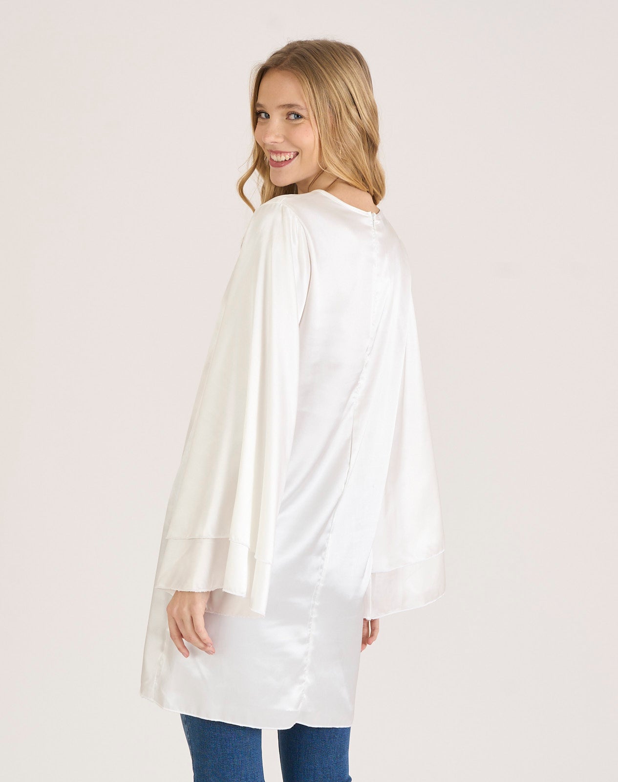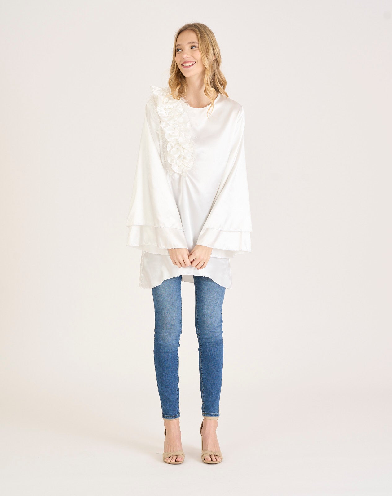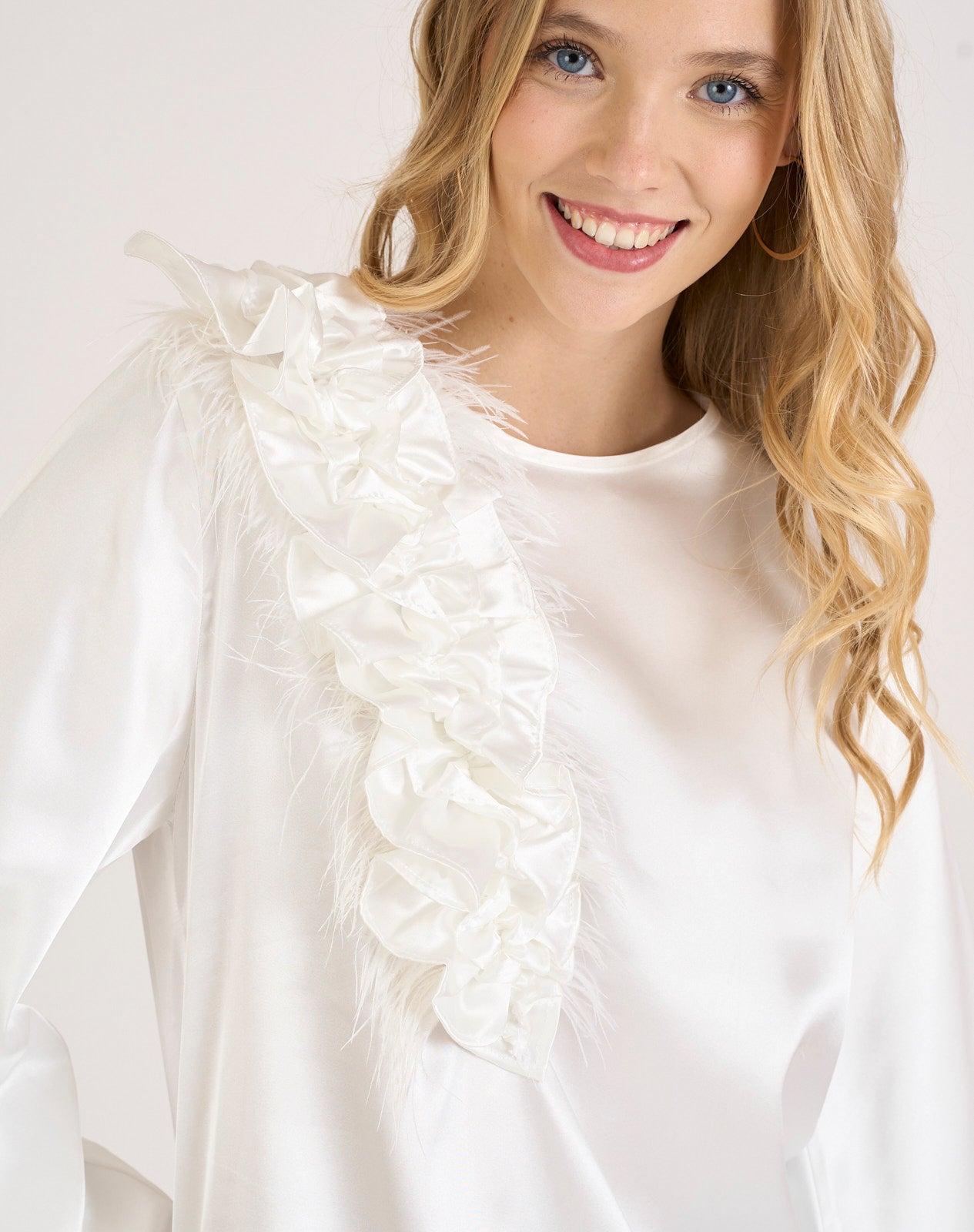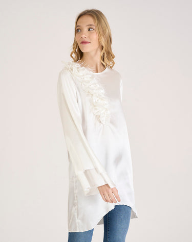 Camisa larga efecto vestido con detalle de flores brocadas y plumas en el lateral. Mangas anchas con acabado de doble volante. Cierre con cremallera trasera. Blanco